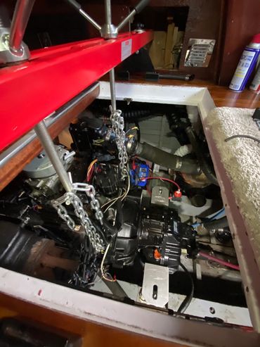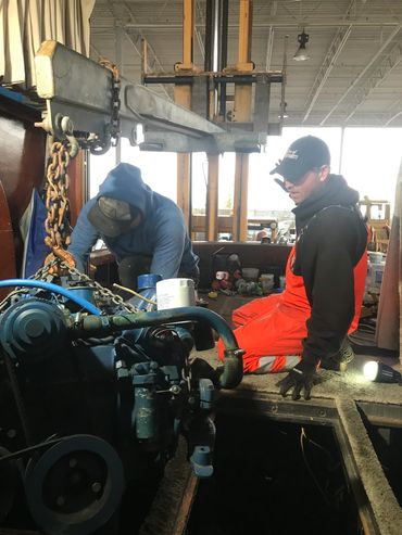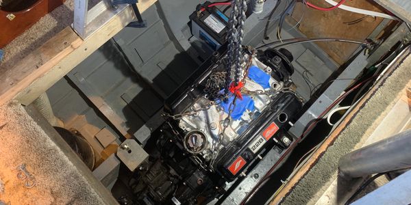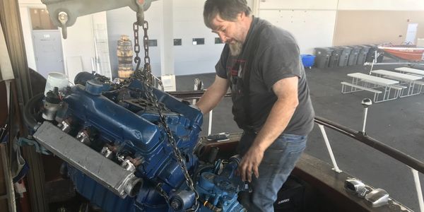 The first huge step was removing her old Ford 454's at the Port of Evertt using cherry pickers.