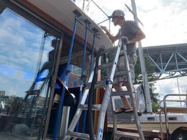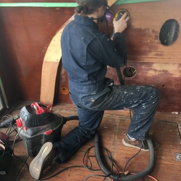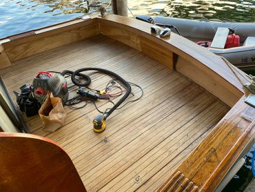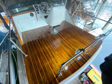 Extensive rot was found in the starboard aft corner which needed serious attention. After a whole lot of plank repair, epoxy molding and paint she looked like it never happened.