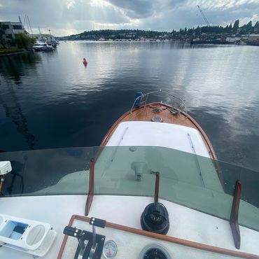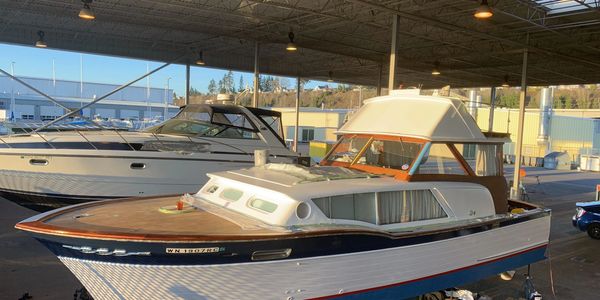 This rare Constellation Express carried a unique history, having once belonged to a Seattle Chris-Craft dealer who outfitted her with an aftermarket flybridge and enclosed cockpit, an uncommon modification for the model.