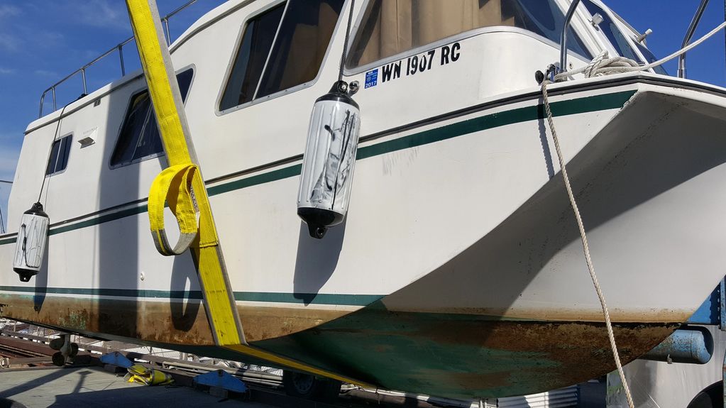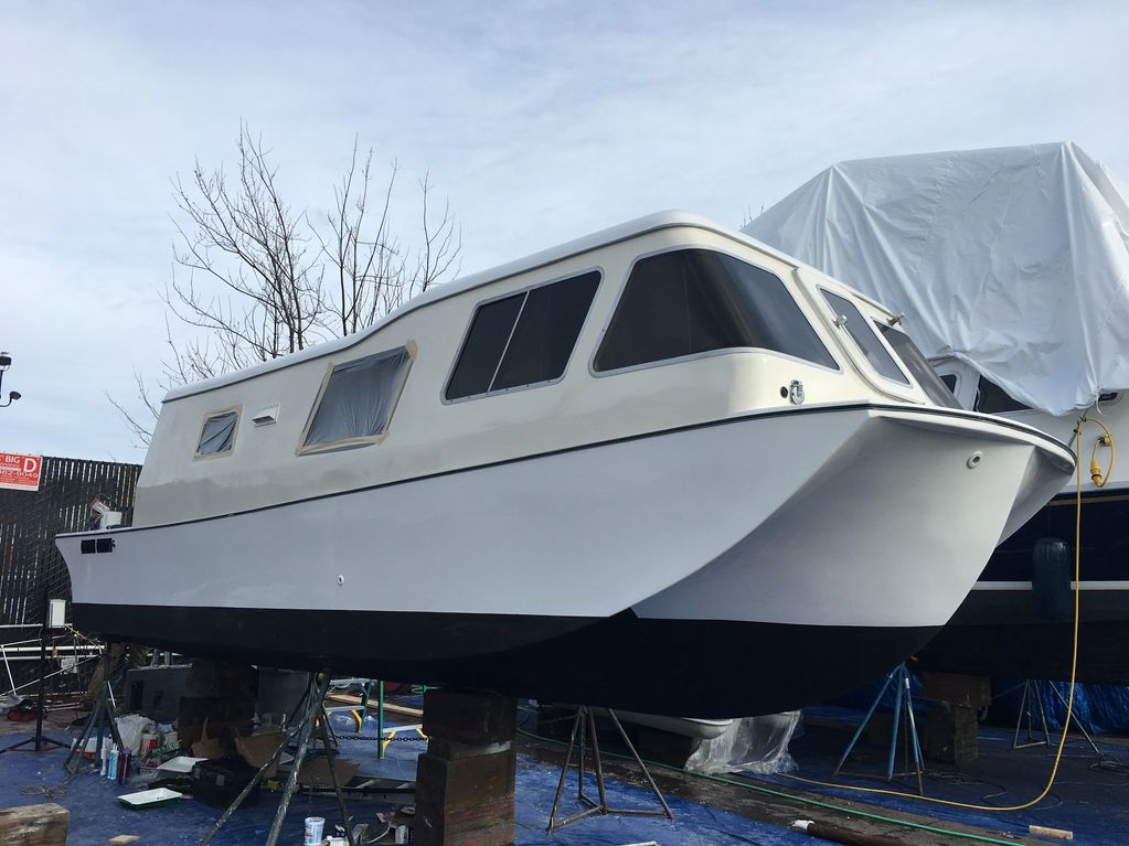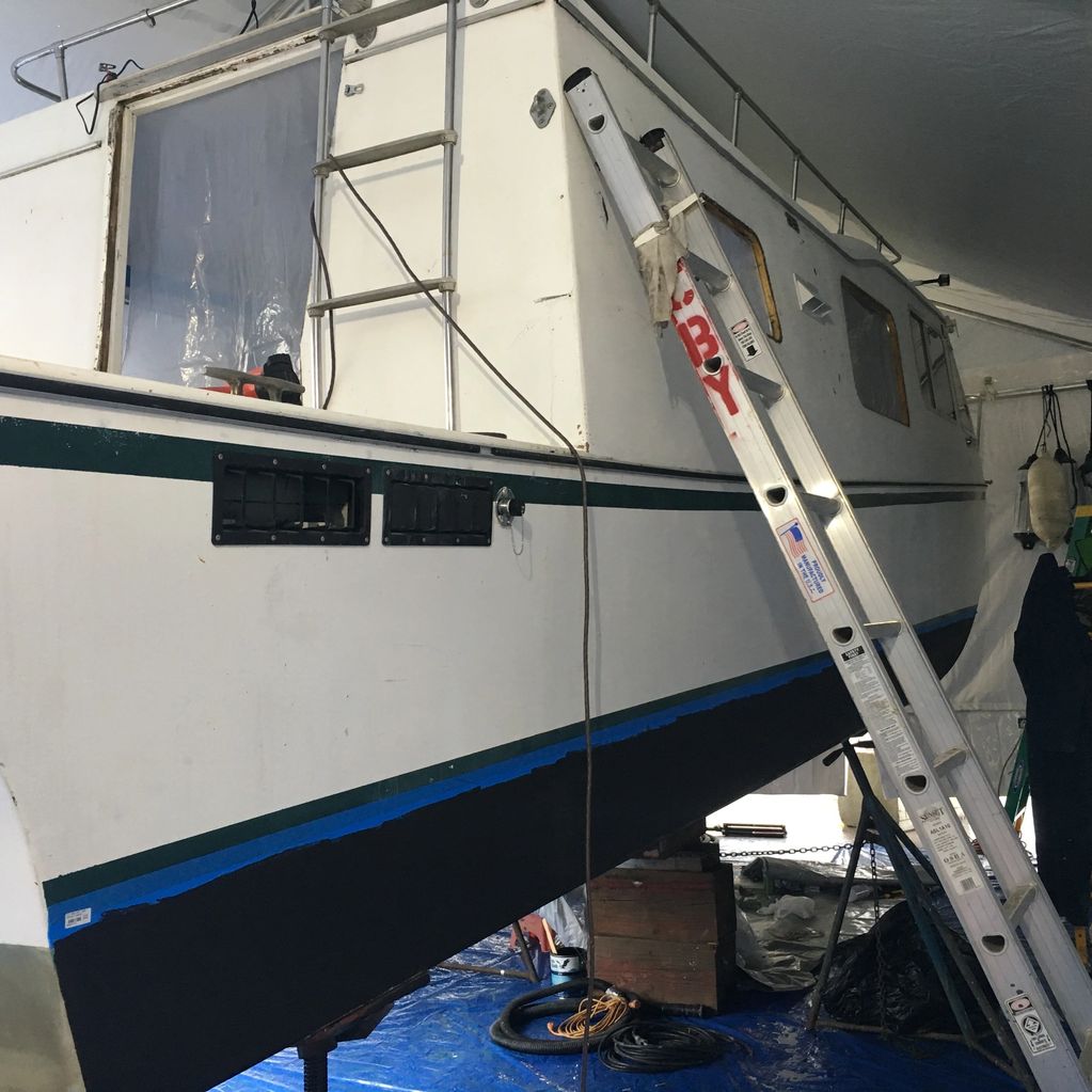 After new bottom, hull and house paint she was ready to go back in the water, although her windows were still waiting for installation and some interior things still needed finishing.